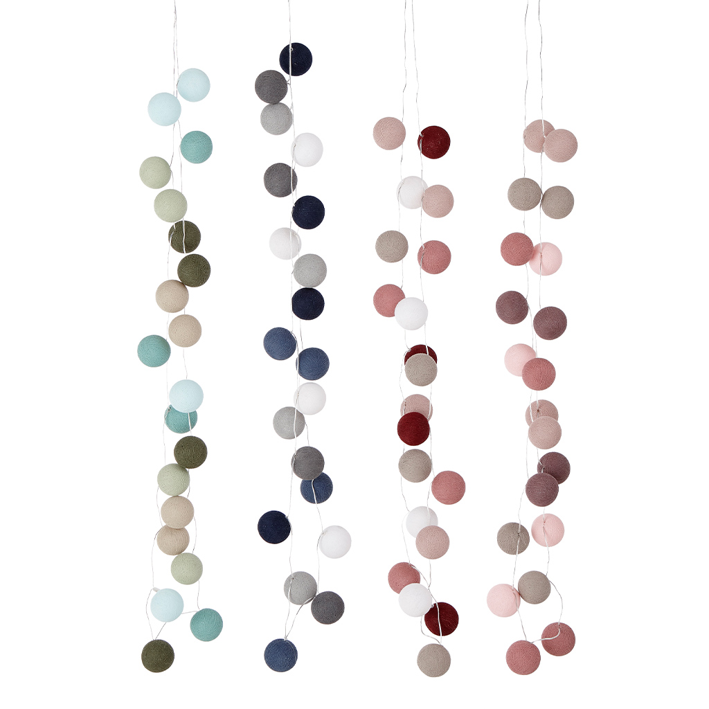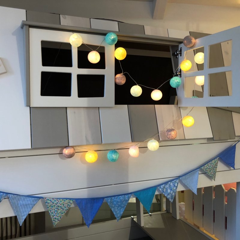 Vervollständigen Sie das Kinderzimmer mit einer wunderbaren gemütlichen Beleuchtung. Diese Baumwolllichtschnur hat 20 Lichter, und Sie können die Schnur in der Farbpalette zusammenstellen, die Sie mögen. Die Wattebäusche sind handgefertigt und Fairtrade-zertifiziert